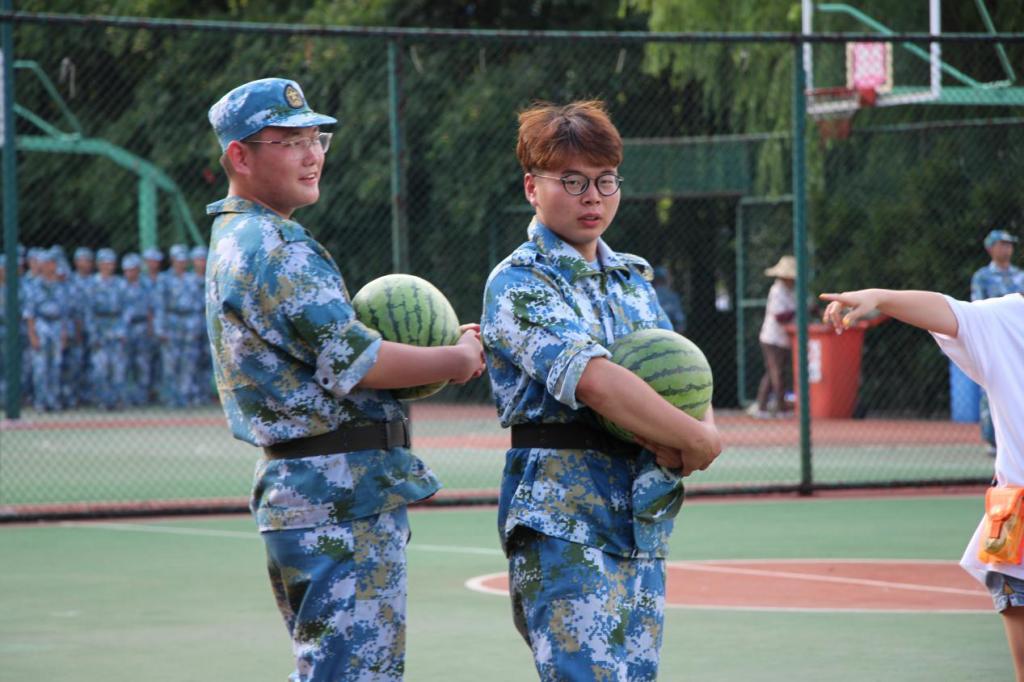 随着营长的一声哨响,各连队暂停训练任务准备休息。青年汽车学院军训新生在工作人员的指引下,自觉地排好队,有序而快速地领取西瓜,部分同学还为自己连队的教官送上了清凉,感谢教官的辛勤指导。