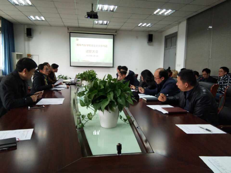 2018年1月3日下午,青年汽车学院党总支召开2017年度党支部书记抓党建工作述职会推动全面从严治党要求落到实处、向基层延伸。青年汽车学院全体党员教师扩大到全体教职工参与本次大会。
