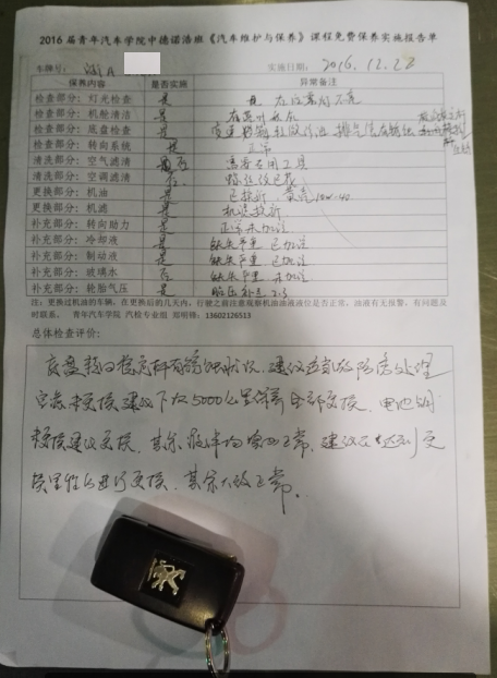 青年汽车学院2016级中德诺浩班《汽车维修与保养》课程,在12月最后课程部分,在青年汽车学院院领导的大力支持下,进行了课程展示,为全校教职工爱车进行免费检查保养,原计划在16个课时的情况下,保养10辆车辆,在全校职工的热情中,最后破额,通过24个课时,共保养了15辆车辆。