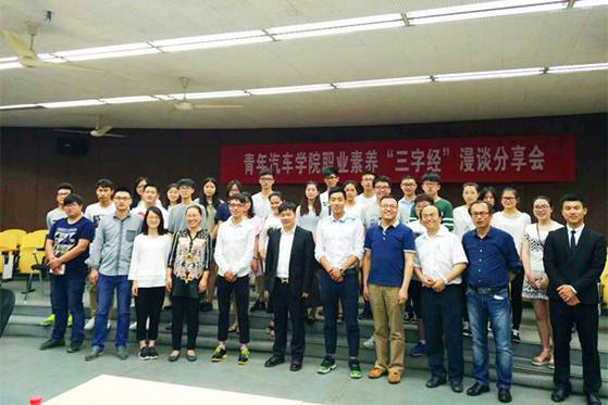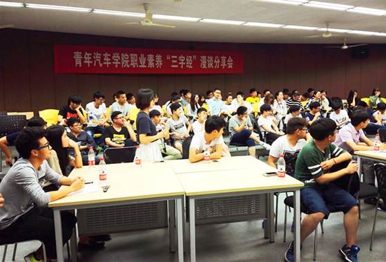 “为自尊的生存,为自我的证明,路上的辛酸已融进我的眼睛,心灵的困境已化作我的坚定……在路上,是我生命的远行。”5月25日下午,伴随着歌曲《在路上》的背景音乐,青年汽车学院职业素养“三字经”漫谈分享会在动漫游戏学院101教室拉开序幕。