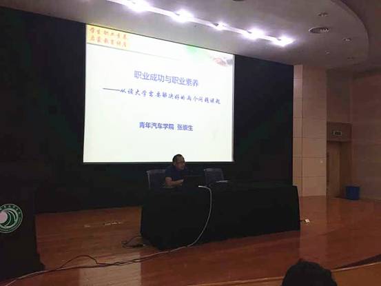 9月14日上午,青年汽车学院新生职业素养启蒙教育讲座在行政楼二楼报告厅举行。党总支副书记张崇生主讲,学工办、团总支负责人、辅导员、全体新生听取了讲座。