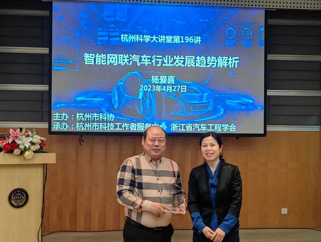 4月27日,杭州大讲堂196讲在杭州市科技交流馆报告厅举行,我校技能大师杨爱喜应邀参加并作题为“智能网联汽车行业发展趋势解析”的科普讲座,90位学生及来自杭州市企事业单位共计120余人参加。