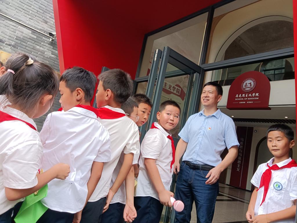 课程结束前,邵立东请孩子们总结该展馆称作“必由之路”纪念馆的原因,孩子们的积极发言得到了他的肯定,他再次强调,只有中国共产党才能团结带领中国人民从水深火热的旧中国逐渐走向如今国富民强的新中国,实现中华民族从站起来到富起来、强起来。最后邵立东指了指孩子们佩戴的红领巾和队徽,再指了指自己胸前佩戴的党徽,告诉他们:“现在你们佩戴的是红领巾和队徽,希望以后大家都能佩戴党徽。”