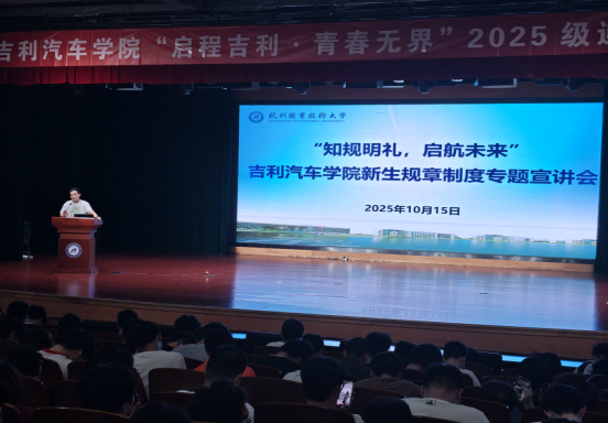 10月15日下午,吉利汽车学院在校图书馆报告厅举办“知规明礼,启航未来”2025级新生规章制度专题宣讲会。学工办、教科办相关负责人及全体2025级新生参与,旨在通过解读规章制度,帮助新生快速适应大学生活,为成长启航筑牢根基。