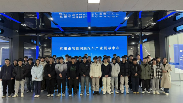 下午,师生们再次出发前往杭州市智能网联汽车产业展示中心。沉浸式体验空间里,大家驻足探索“智能网联”主题展项,在产业发展成果展示区详细了解杭州智能网联汽车产业的发展布局、技术突破与应用落地情况,对智能驾驶研发、车联网运营、产业规划等岗位有了更直观的认知。参观尾声,师生们在主题大屏前合影留念。