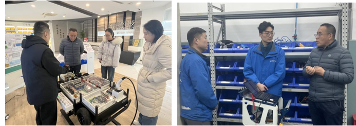 在浙江车易达科技发展有限责任公司,技术专家蔡飞重点介绍了新能源汽车电池检测与维护的实际项目案例,双方就相关技术难点、人才培养需求以及潜在产学合作项目进行了深度交流和探讨。