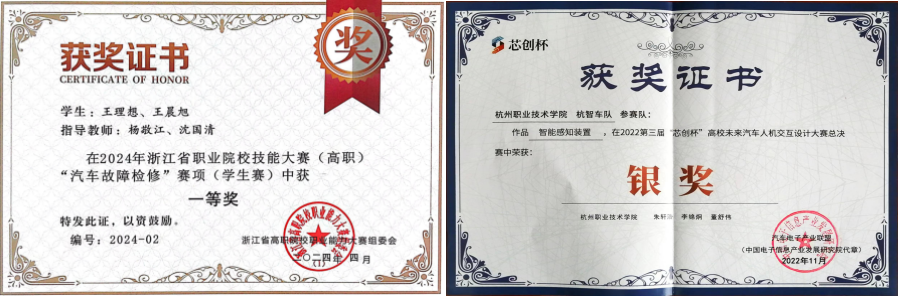 (3)学生成长成果丰硕:育人成效显著,学生近两年在浙江省高职院校技能大赛、“芯创杯”高校未来汽车人机交互设计大赛、一带一路暨金砖国家技能发展与技术创新大赛等省级及以上赛事中屡获佳绩,充分展现专业技能与创新能力。毕业生面向智能网联汽车全产业链高薪岗位(如测试、装调、标定工程师等),发展前景广阔。